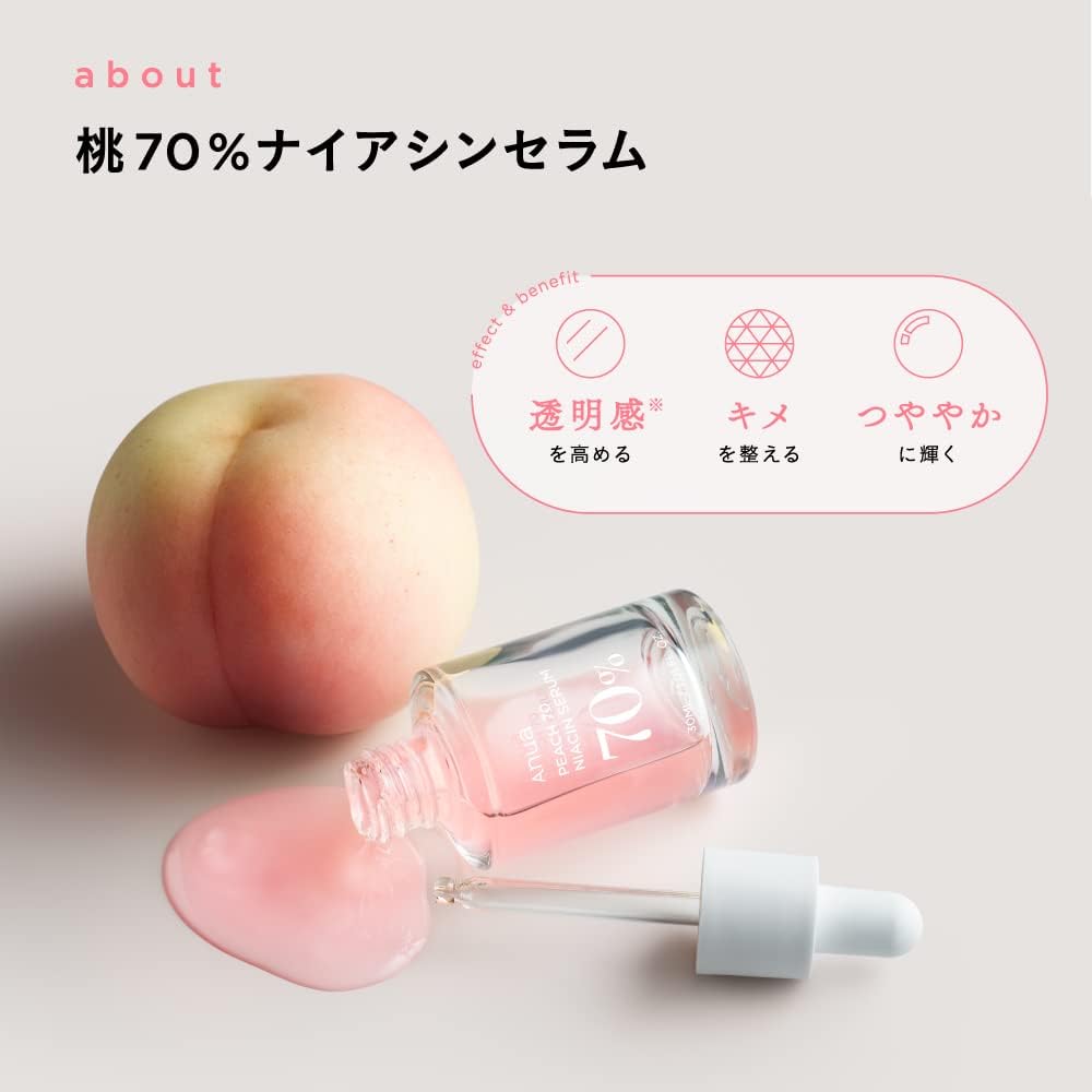 Contém 70% de PEACHNIA(TM), um ingrediente de origem natural extraído de pêssegos, e contém muitos ingredientes de beleza, como vitaminas, polifenóis e taninos para iluminar e iluminar sua pele. Além disso, contém 5% de niacinamida, que melhora a transparência da pele, e inibe a exposição da melanina, que causa manchas e sardas, na superfície da pele, resultando em uma pele transparente e clara. Ingredientes suaves de origem natural proporcionarão uma pele lisa e cor de pêssego, com belo tom, textura e brilho, sem agredir a pele.