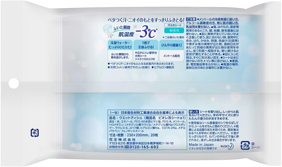 Refresque todo o seu corpo com apenas um lençol! Um lençol antissuor que reduz a temperatura da pele para -3°C (*) no momento da limpeza. Com bastante água de resfriamento, o calor escapa no momento em que você o limpa. Contém mentol para manter a pele limpa e renovada! Uma folha grande e grossa que é difícil de rasgar. Limpe manchas de sebo que causam suor e odor pegajoso. Contém ácido hialurônico. Existem 3 tipos de fragrâncias para escolher (Sem Perfume/Floral Refrescante/Sabonete de Pêssego). *Quando limpo duas vezes.