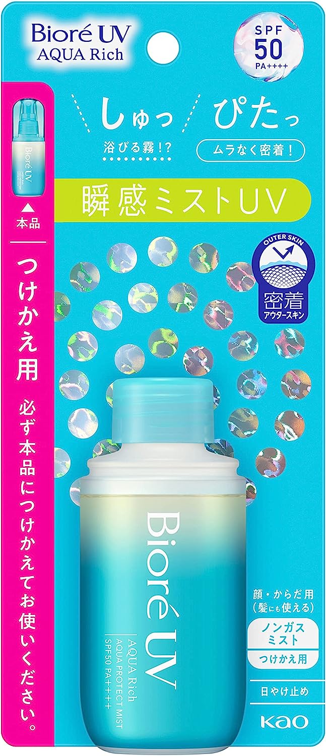 Biore UV Aqua Rich Aqua Protect Mist tem uma névoa tipo névoa que seca rapidamente e adere à pele uniformemente. A névoa refrescante e de secagem rápida se define com uma textura leve, não pegajosa e suave, sem tom branco. Não é necessário agitar o frasco antes da aplicação, pode ser usado de cabeça para baixo, pode ser usado no couro cabeludo e no cabelo e pode ser usado na maquiagem. Este produto pode ser usado a qualquer hora, em qualquer lugar de corpo inteiro para proteção rápida. Este é um tipo de névoa sem gás e pode ser usado para rosto e corpo (também pode ser usado para cabelos). Super impermeável e pode ser removido com sabão.