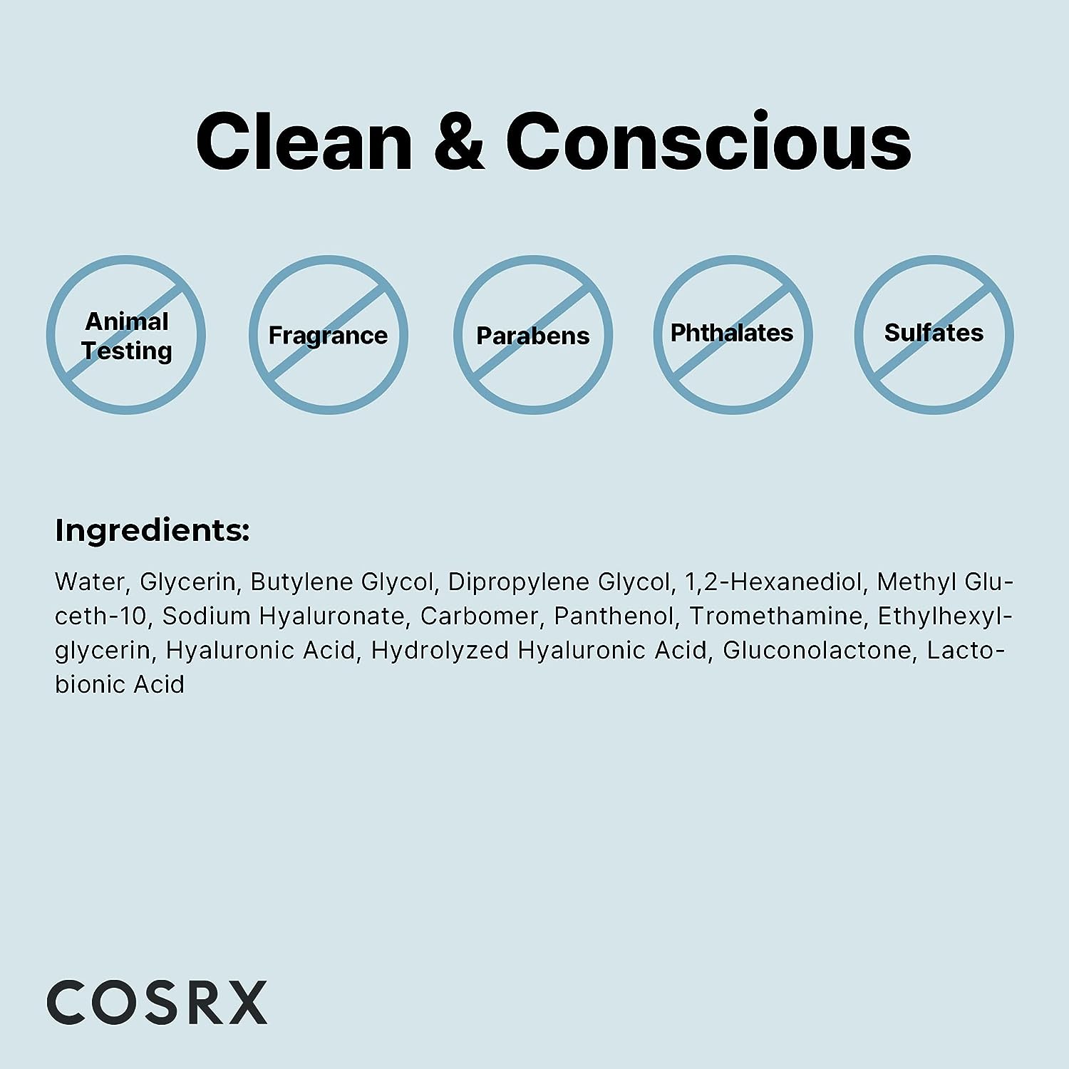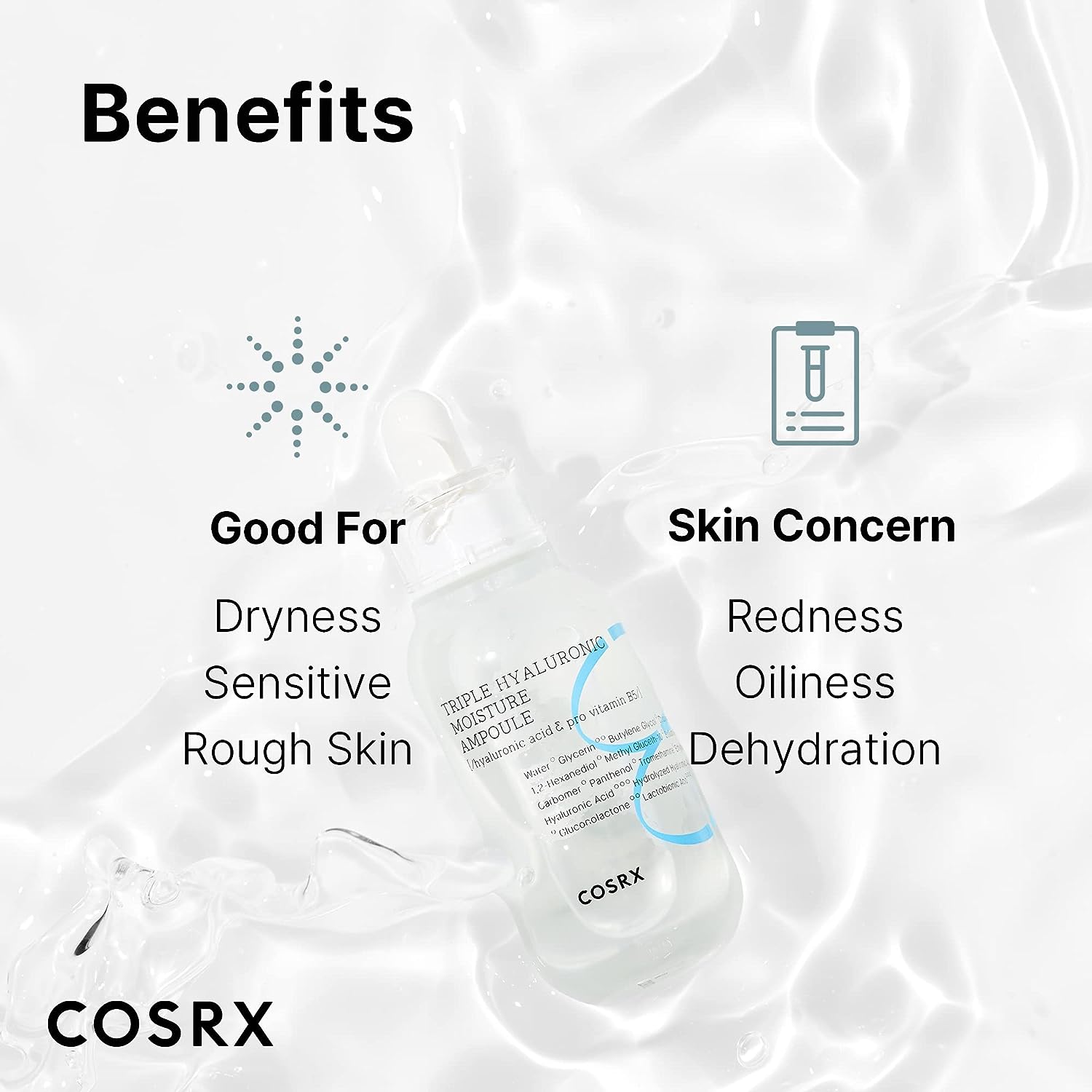 A Ampola de Umidade Tripla Hialurônica COSRX Hydrium é um soro hidratante viscoso que deixa a pele seca ou desidratada, macia e hidratada. A vitamina B5 (d-pantenol) hidrata e atua como agente antiinflamatório, enquanto o ácido hialurônico retém a umidade e ajuda a preencher a pele.