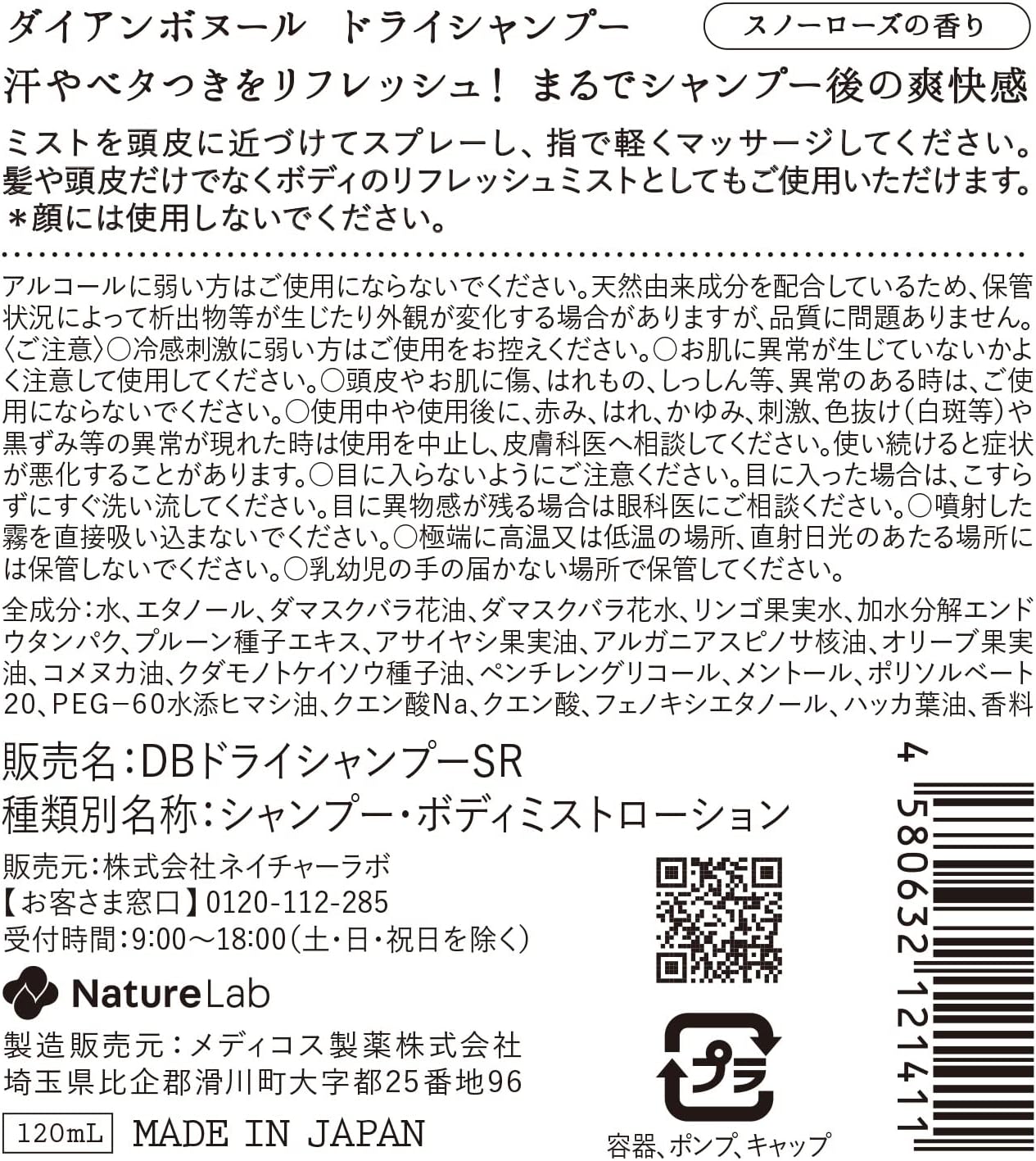 água, etanol, óleo de pétala de rosa de damasco, flores de rosa de damasco, água de maçã, proteína de ervilha hidrolisada, extrato de semente de ameixa, óleo de palma de açaí, óleo nuclear de argan spinosa, óleo de oliva, óleo de cosenuka, óleo de semente de cedaronoon, alicate glicol, mentol, polissorbato 20, óleo de rícino aquático PEG-60, óleo de rícino aquático PEG-60, óleo cítrico cítrico, Na, ácido cítrico, fenoxietanol, óleo de folha de hortelã-pimenta, fragrância