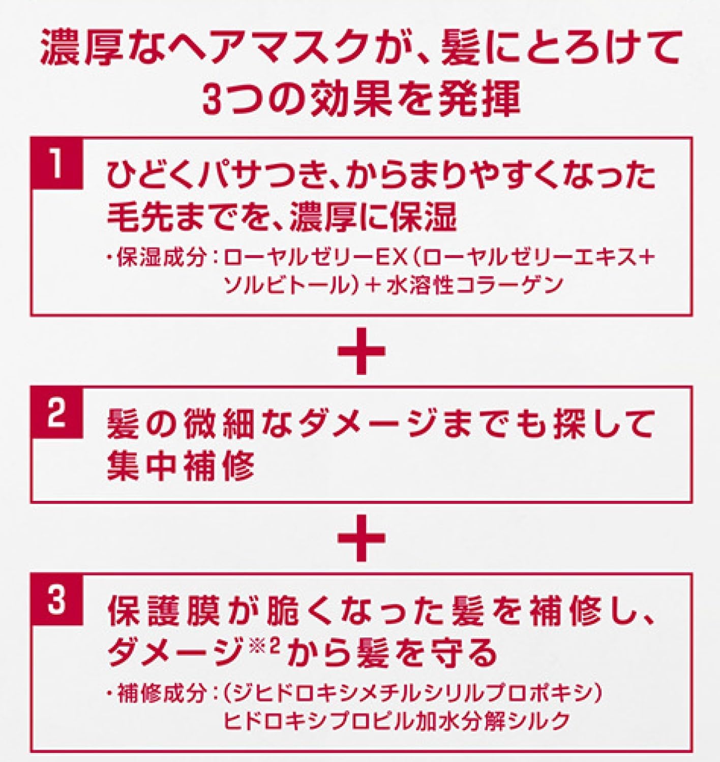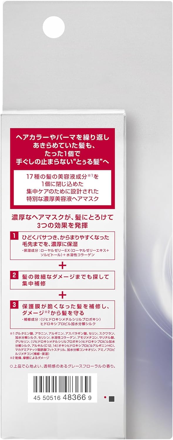 Após o shampoo, hidrate levemente e evite o couro cabeludo, e aplique uma dose de cabelo (1 peça) no centro dos cabelos danificados. Por favor, prenda suavemente o cabelo para que a máscara possa penetrar no cabelo. Depois disso, enxágue com água morna. (Funcionará bem mesmo se você enxaguar imediatamente.) Por ser altamente eficaz, recomendamos usá-lo 2 a 3 vezes por semana.