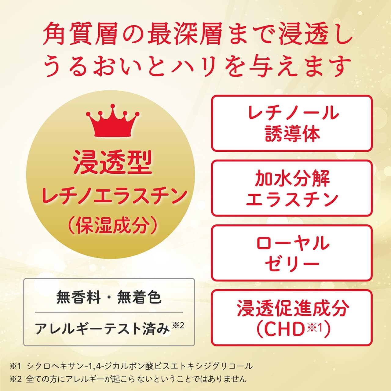 Água, glicerina, etanol, DPG, PEG-75, palmitato de retinol, extrato de geléia real, extrato de raiz de Scutellaria, ciclohexano-1,4-dicarboxilato de bisetoxidiglicol, colágeno hidrolisado, hialuronato de sódio, extrato de placenta de melão, extrato de fruta yuzu, extrato de folha de alecrim, suco de aloe vera, extrato de flor de camomila, extrato de raiz de alcaçuz, extrato de folha de chá, extrato de folha de sálvia, extrato de raiz de althea, extrato de pepino, extrato de erva-doce, extrato de centella asiática, extrato de raiz de knotweed japonês, poliglicerina-6, sorbitol, PEG-60 óleo de rícino hidrogenado, BG, carbómero, goma xantana, esqualano, fenil trimeticona, polissorbato 20, maltitol, hidróxido de potássio, óleo de milho, EDTA-2Na, fenoxietanol, metilparabeno