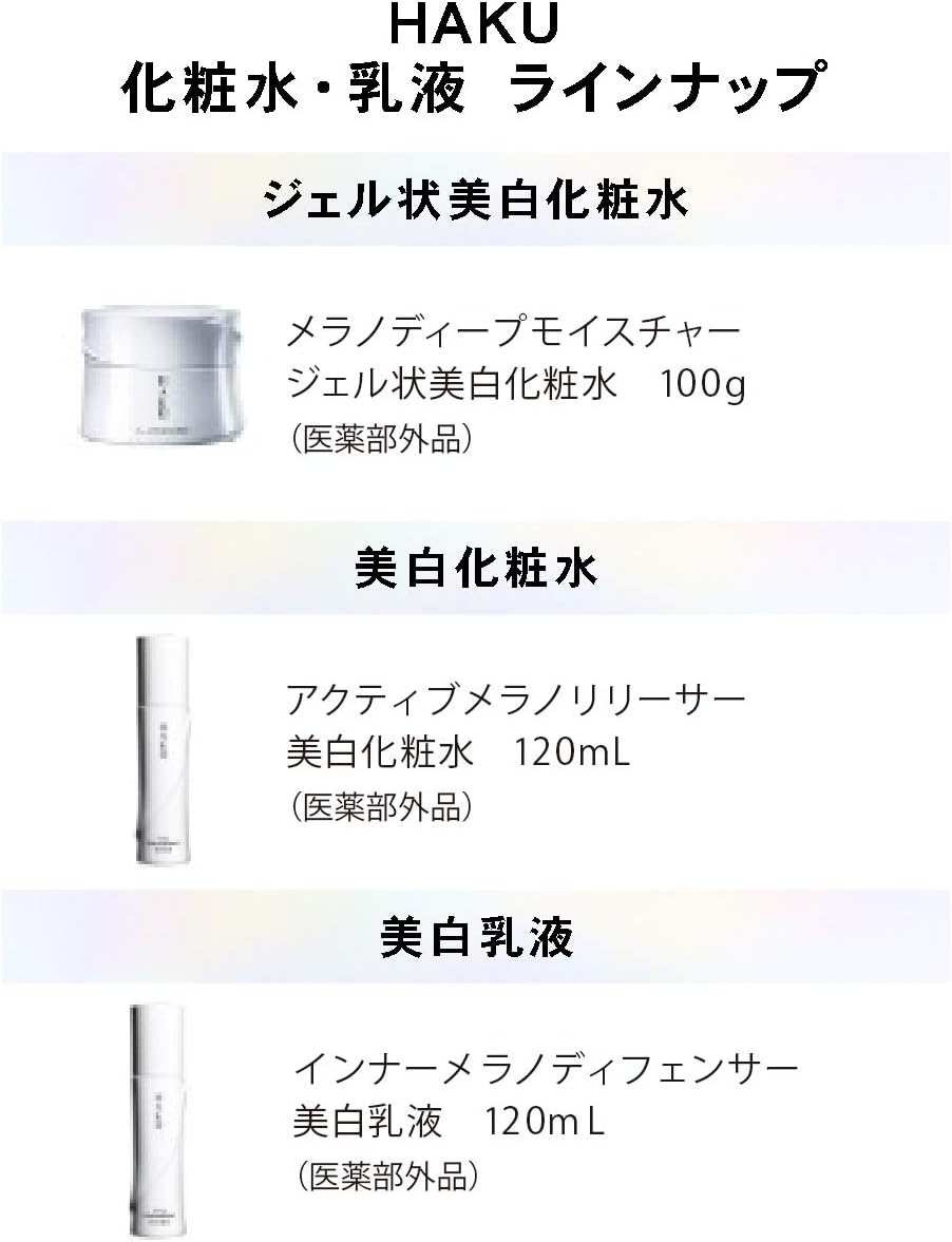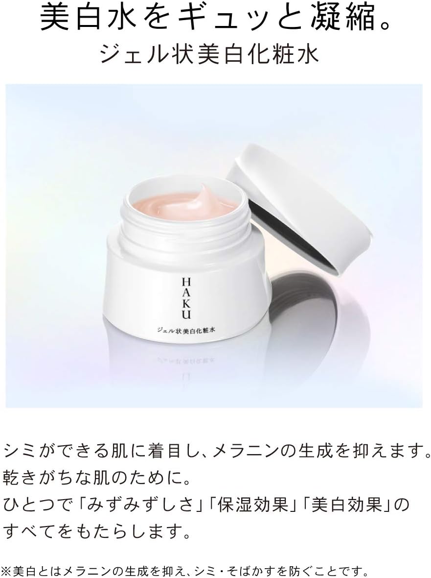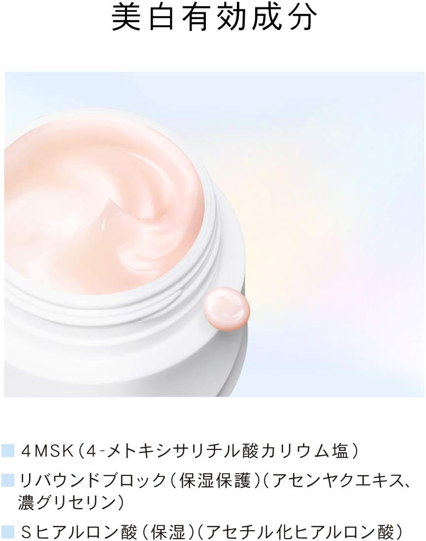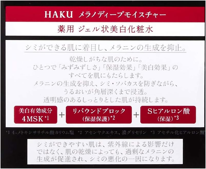Uma loção clareadora tipo gel altamente concentrada com água clareadora . Concentra-se na pele onde ocorrem manchas e suprime a produção de melanina. Para peles com tendência a ressecar, proporciona todos os benefícios de “frescor”, “efeito hidratante” e “efeito clareador ”. Contém princípio ativo clareador 4MSK (sal de potássio do ácido 4-metoxisalicílico), rebote block (proteção hidratante) (extrato de Acacia japonica, glicerina concentrada) e ácido hialurônico S (hidratante) ( ácido hialurônico acetilado). A umidade penetra profundamente no estrato córneo, mantendo a pele limpa e úmida.