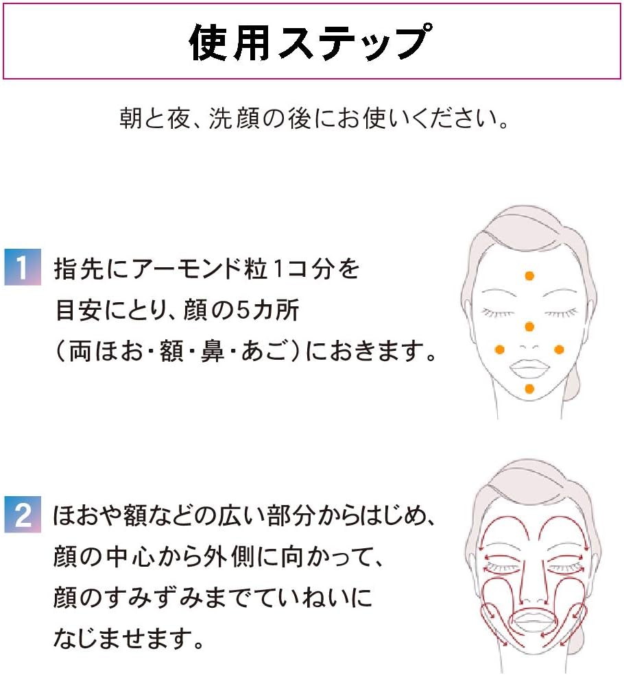 Use de manhã e à noite após lavar o rosto. Na ponta dos dedos, pegue 1 pedaço de grão de amêndoa e coloque em 5 lugares do rosto (ambos os lados, testa, nariz, queixo). Comece em uma área ampla, como uma testa frágil, e misture suavemente com o rosto, do centro para o canto externo.