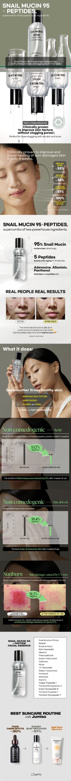 Jumiso Snail Musin 95+ Peptide Facial Essence 140ml Contém extrato de caracol.
