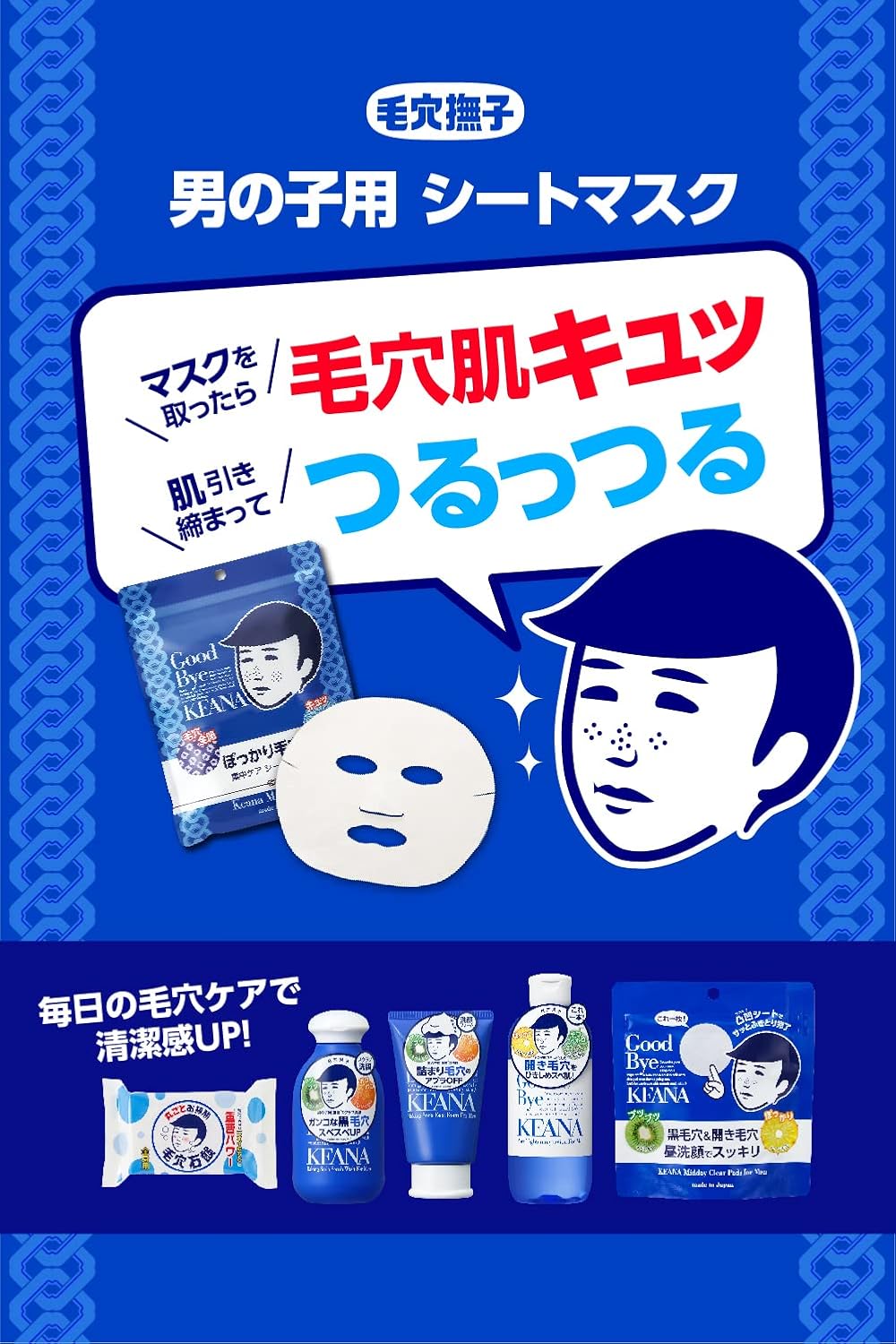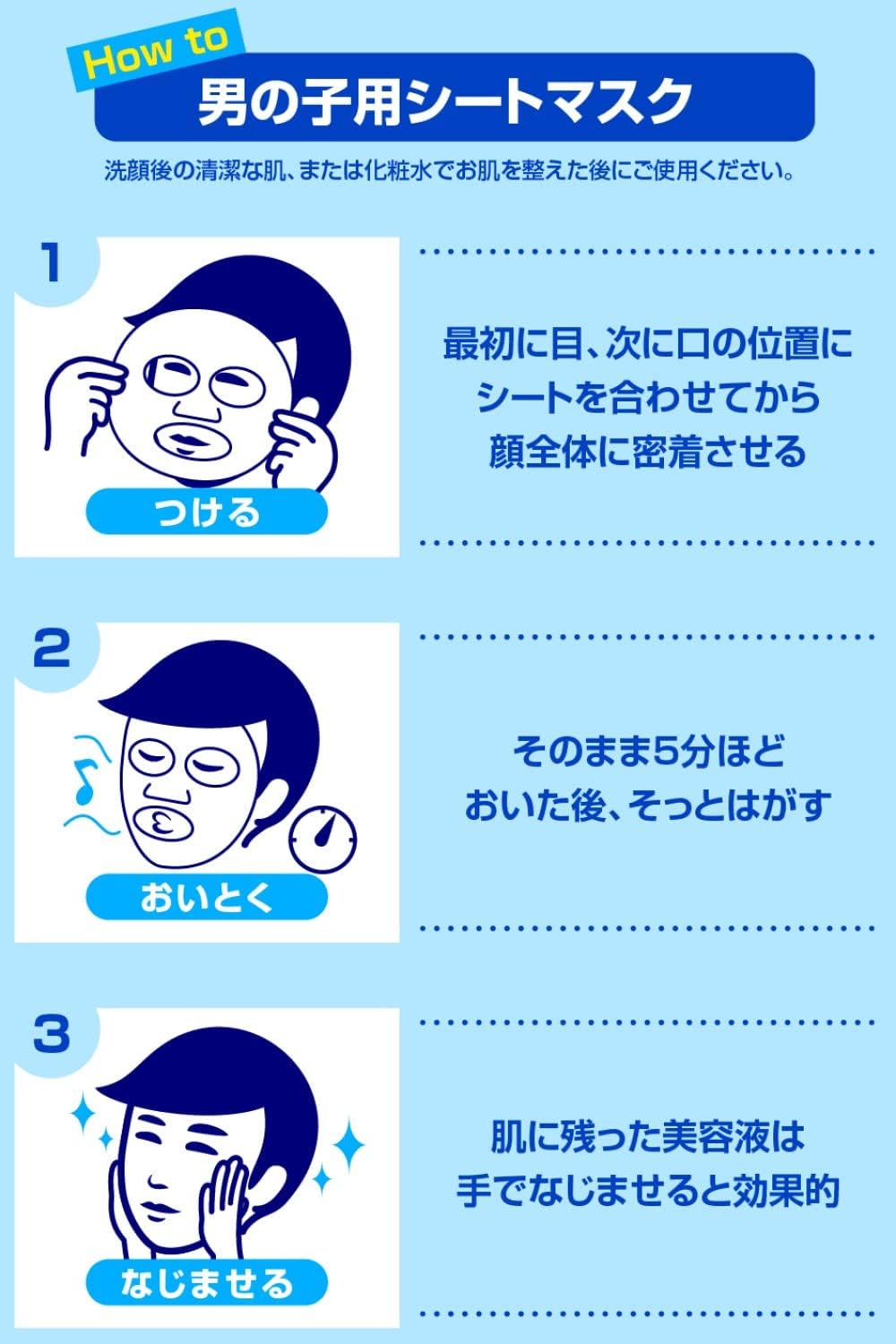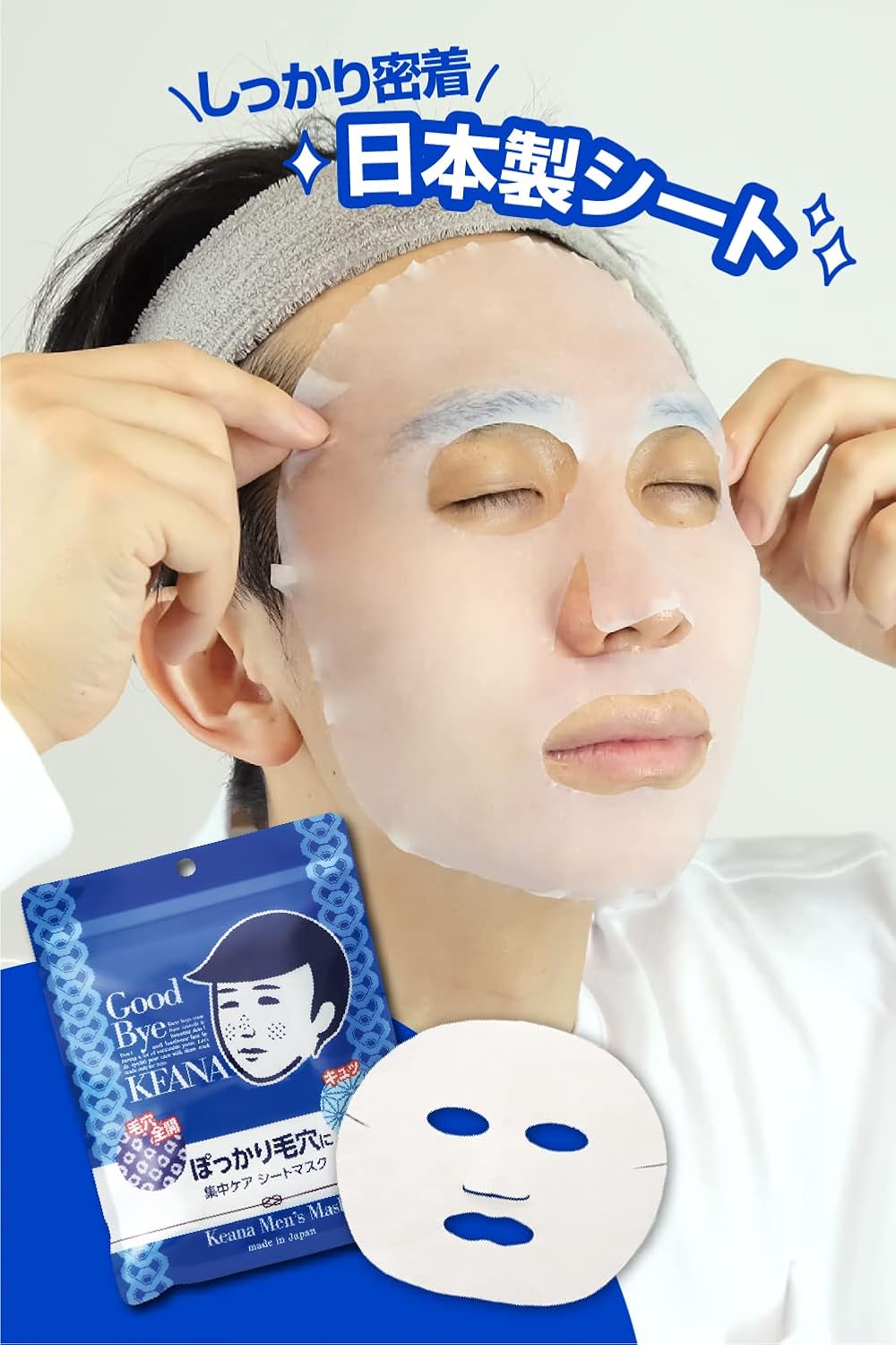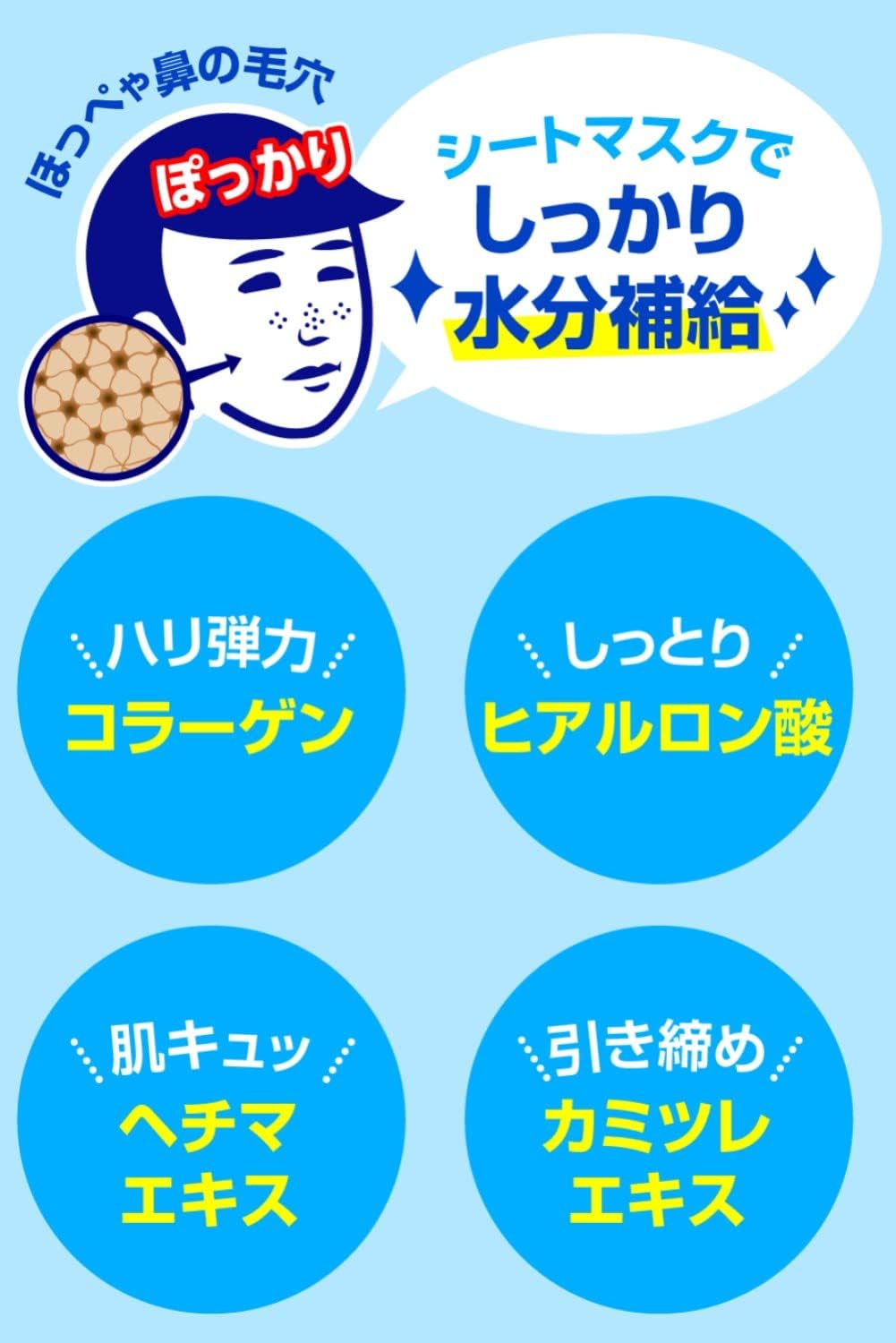 Repõe a hidratação que tende a faltar e aperta a pele. Ao tirar a máscara de lençol, você terá instantaneamente uma segunda pele! Ingredientes hidratantes para a pele nua dos homens ●Dureza e elasticidade…Colágeno ●Fornecimento de umidade…Ácido hialurônico ●Aperto da pele…Extrato de bucha ●Aperto da pele…Extrato de camomila Esta máscara de folha grossa feita no Japão é embebida com bastante ingredientes hidratantes.