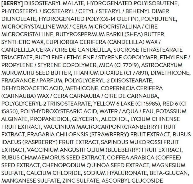 Malato de diisoestearil, poliisobuteno hidrogenado, fitosteril/isoestearil/cetil/estearil/dímero de behenil dilinoleato, polímeros hidrogenados de olefina C6-14, polibuteno, cera microcristalina, manteiga de karité, cera sintética, cera de candelila, triacetato de tetraestearato de sacarose, copolímero hidrogenado de butileno/etileno/estireno , copolímero de etileno / propileno / estireno, mica, manteiga de semente de Astrocaryum murumuru, dióxido de titânio, dimeticona, aromáticos, diisoestearato de poligliceril-2, ácido desidroacético, meticona, cera de carnaúba, triisoestearato de poligliceril-2, CI 15985, CI 15850, ácido poli-hidroxiesteárico, água , Alginato de potássio, propanodiol, glicerina, álcool, extrato de fruta de lício, extrato de fruta de cranberry, extrato de fruta de morango, extrato de fruta de framboesa, extrato de fruta de Sapindus mukurossi, extrato de fruta de mirtilo, extrato de semente de Rubus chamaemorus, extrato de café,Extrato de Semente de Chenopodium quinoa, Sulfato de Magnésio, Cloreto de Cálcio, Hialuronato de Sódio, Beta-Glucano, Sulfato de Manganês, Sulfato de Zinco, Ascorbil Glucosídeo.