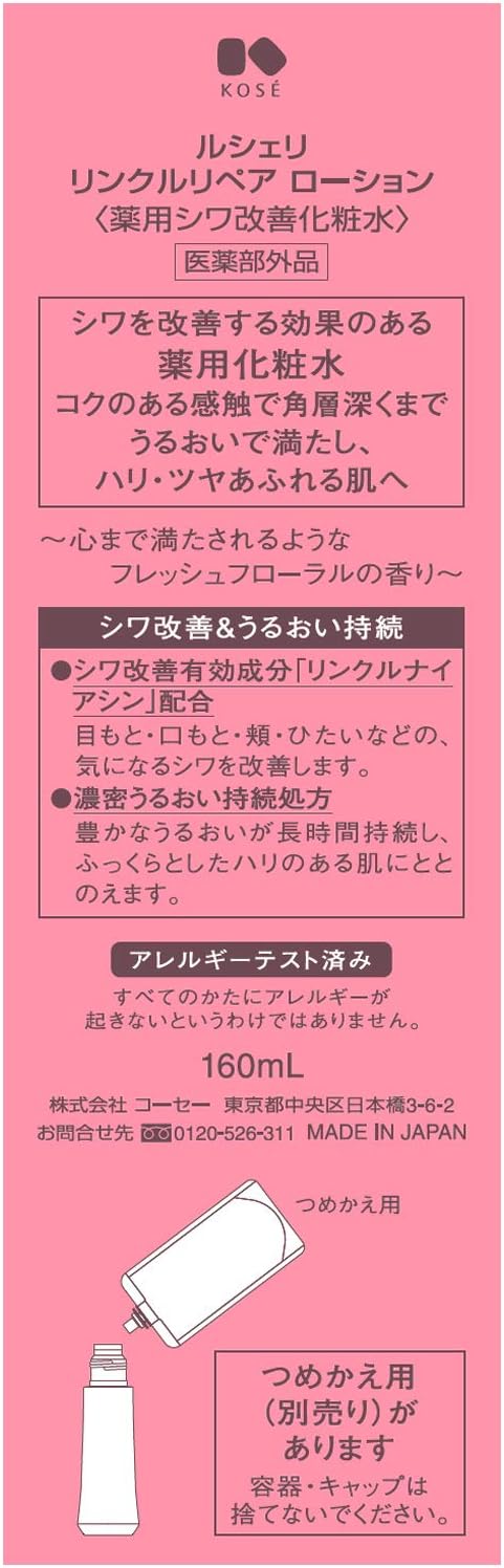 Uma loção medicamentosa para melhorar as rugas que tem uma sensação rica e preenche o estrato córneo com umidade . Focamos no fato de que os movimentos das expressões faciais formam rugas. Os cuidados diários com a pele melhoram rugas e pequenas rugas que são difíceis de ver. Possui uma textura rica que preenche o estrato córneo de umidade , deixando a pele brilhante. Contém niacina, ingrediente ativo que melhora as rugas. Aproxima-se tanto da epiderme como da derme e é eficaz para todos os problemas de rugas. Contém a tecnologia de penetração exclusiva da Kose, “cápsulas de ionização”. Cápsulas com excelente poder de penetração fornecem umidade e ingredientes cuidadosamente selecionados profundamente no estrato córneo. Contém ingredientes hidratantes de colágeno , deixando a pele macia e firme. Uma fragrância floral fresca à base de Muguet (lírio do vale) que vai encher a sua alma.