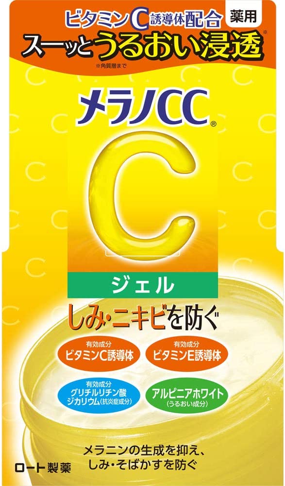 Melano CC Medicated Stain Prevention Gel é um gel hidratante refrescante com ingrediente ativo derivado de vitamina C (*1). Ao mesmo tempo que hidrata a pele, penetra profundamente nos derivados da vitamina C na camada do estrato. Reduz a geração de melanina, previne manchas e sardas e deixa a pele limpa. Também é formulado com um ingrediente circulante no sangue “derivados da vitamina E * 2” e ingrediente antiinflamatório de glicirrizinato dipotássico. Também previne acne incômoda. Além disso, também é formulado com o ingrediente hidratante “Alpinia White”. Os vestígios de acne irão hidratar e condicionar a pele. Pode ser usado como substituto de emulsão ou creme quando desejar repor a umidade. Também é recomendado o uso no corpo que foi exposto aos raios ultravioleta. Manhã e noite. Aroma cítrico 1: Ácido L-Ascórbico 2-Glucocida. *2: Acetato de tocoferol. *3: Extrato de Semente de Alpinia Katsuma.