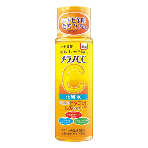 Melano CC Medicated Stain Prevention Beauty Lotion Moisturizing Type “é uma loção clareadora medicinal que pode proteger contra manchas e ao mesmo tempo hidratar todo o rosto. O derivado de vitamina C altamente penetrante do ingrediente ativo clareador penetra profundamente na camada do estrato, suprime a geração de melanina, evitando manchas e sardas e proporcionando uma pele com sensação de transparência. Contém também 2 ingredientes anti-inflamatórios e 3 tipos de ingredientes hidratantes. Hidrata e modela a pele após a acne. Possui um aroma cítrico refrescante. *1: 3-O- ácido etil ascórbico *2: glicirrizinato dipotássico *3: alpinia branca, extrato de limão, extrato de toranja.