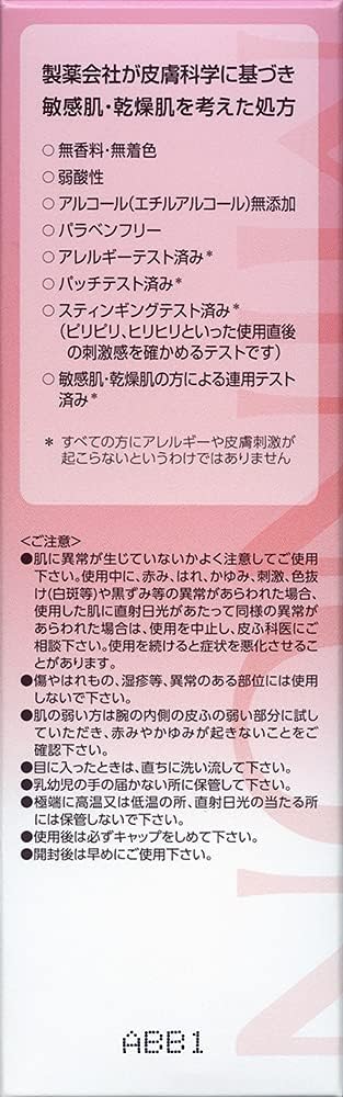 Sem fragrância, sem corantes; Ácido fraco; Álcool (álcool etílico); Sem parabenos; Absorvente UV; Testado como não comedogênico; Alérgico testado; Patch testado; Picada testada; (testado para garantir irritação imediatamente após o uso, como bolinhas, formigamento e formigamento na pele.) Pessoas com alergias e irritação na pele Não causa acne ou acne.