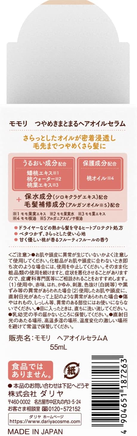 Contém 4 tipos de ingredientes derivados do pêssego ( ingredientes hidratantes e ingredientes protetores) e ingredientes retentores de água. O óleo sedoso penetra no cabelo, deixando-o brilhante e sedoso até as pontas.