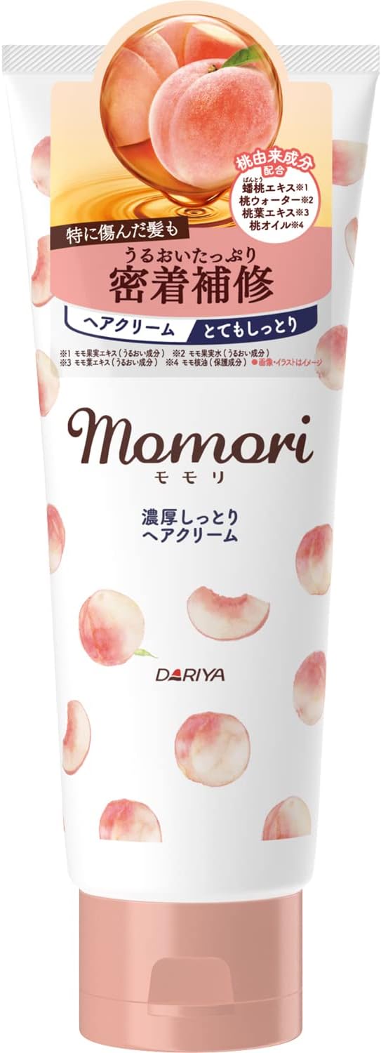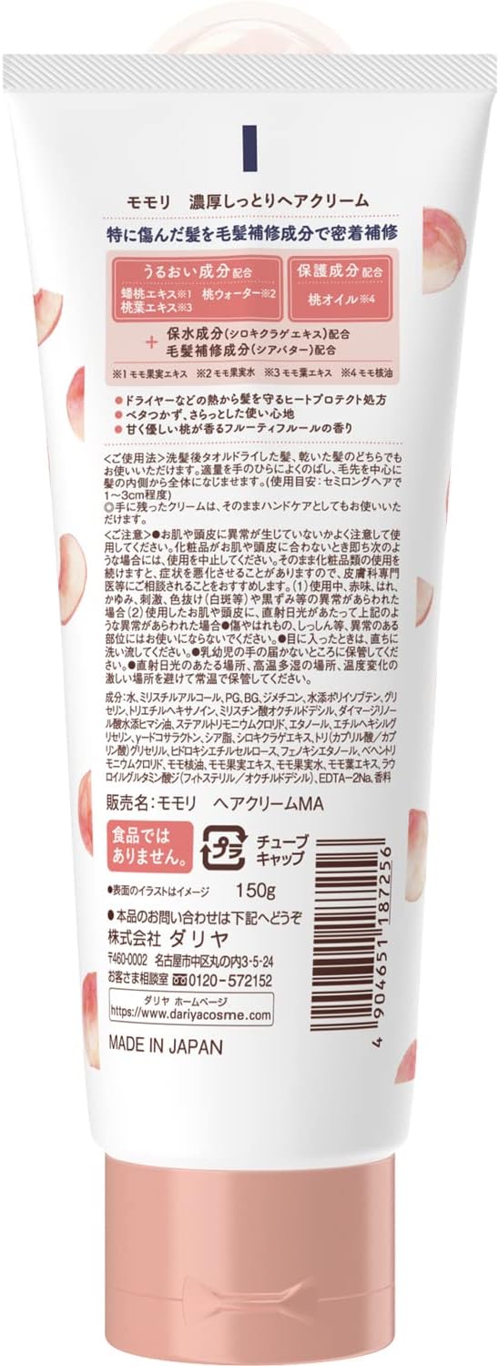 Contém 4 tipos de ingredientes derivados de pêssego (ingredientes hidratantes e protetores) e ingredientes retentores de água. Creme para cabelos muito úmido que pode ser usado para reparar cabelos danificados. TAMANHO: 150 ml
