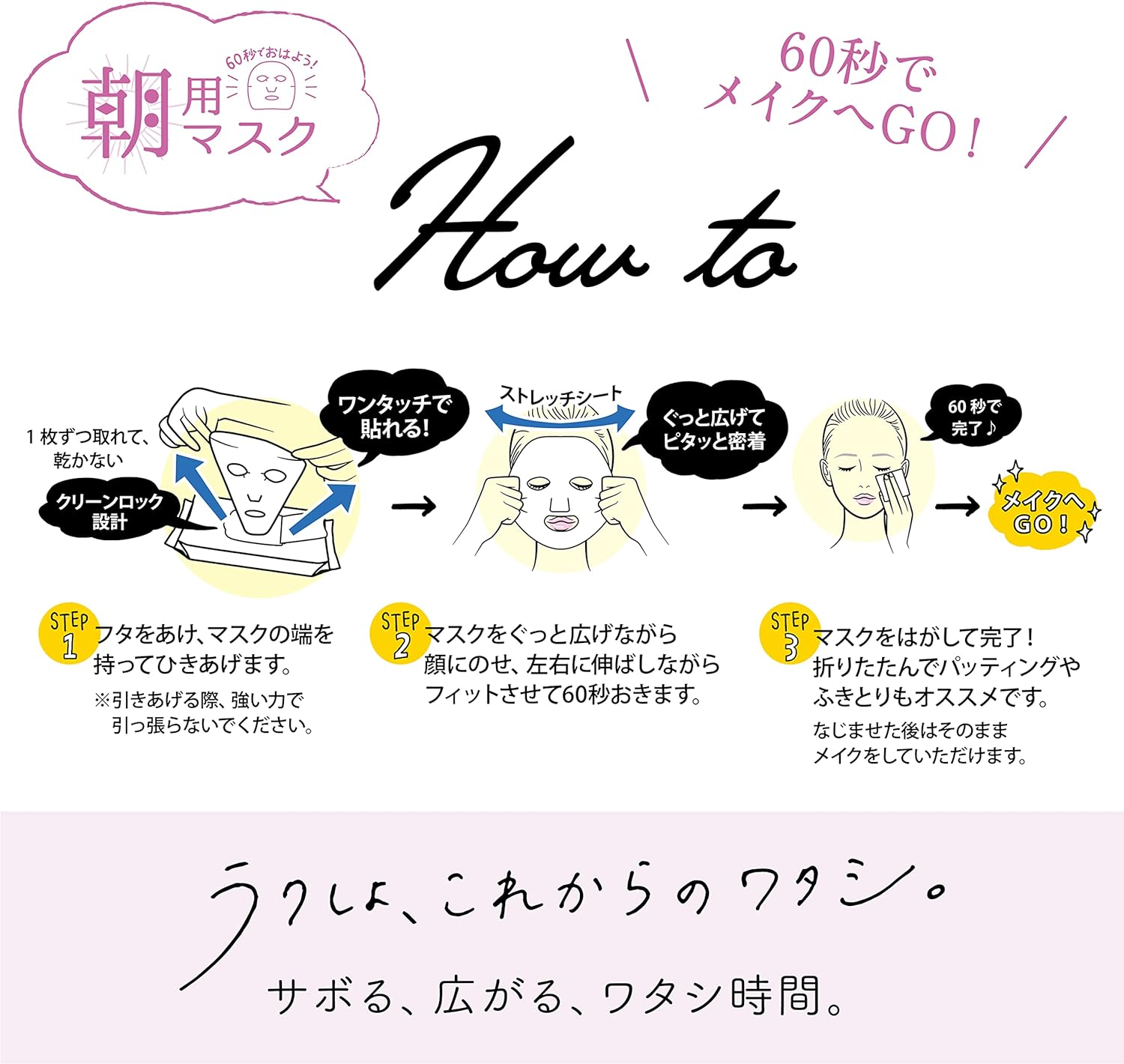 [O segredo por que é tão fácil de usar] A máscara tem uma elasticidade incrível. Estica e adere firmemente ao rosto. Remova a máscara após 60 segundos e está tudo pronto. Também recomendamos que você o use dobrando-o e dando tapinhas na pele.