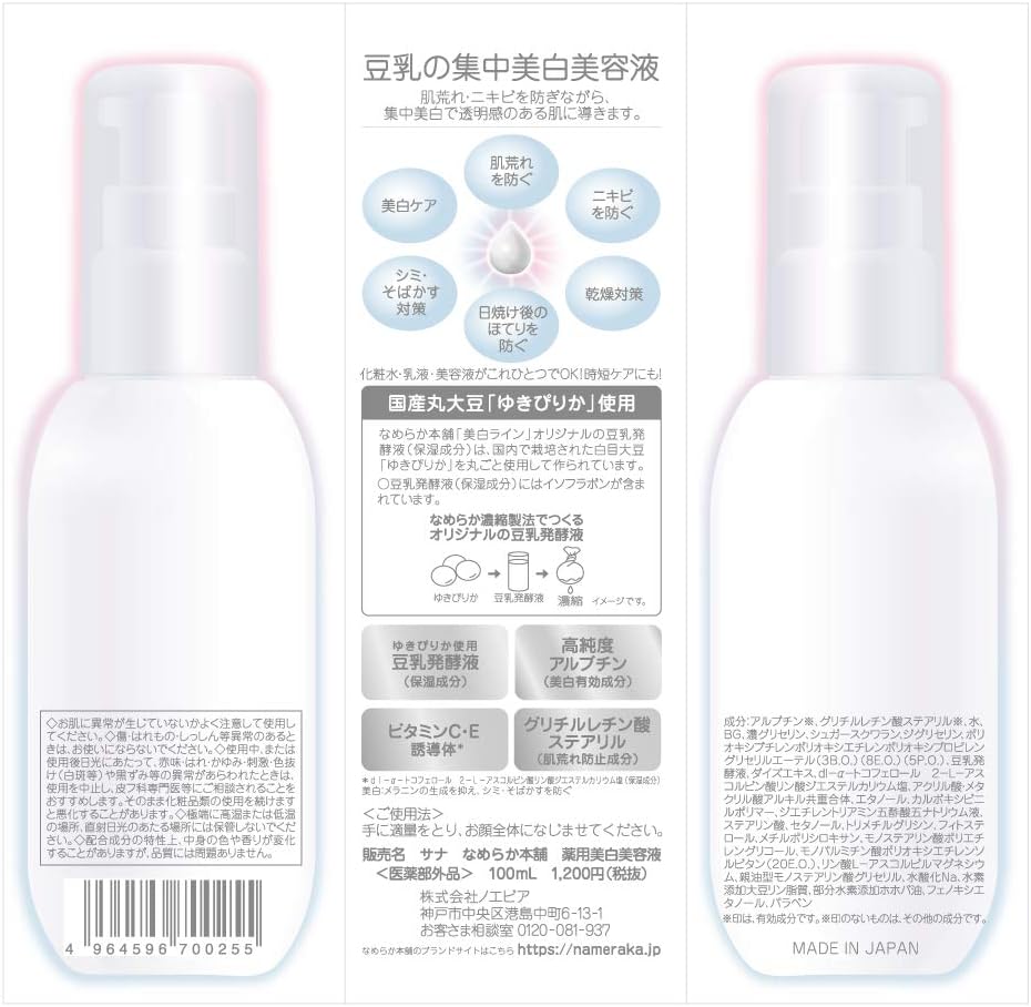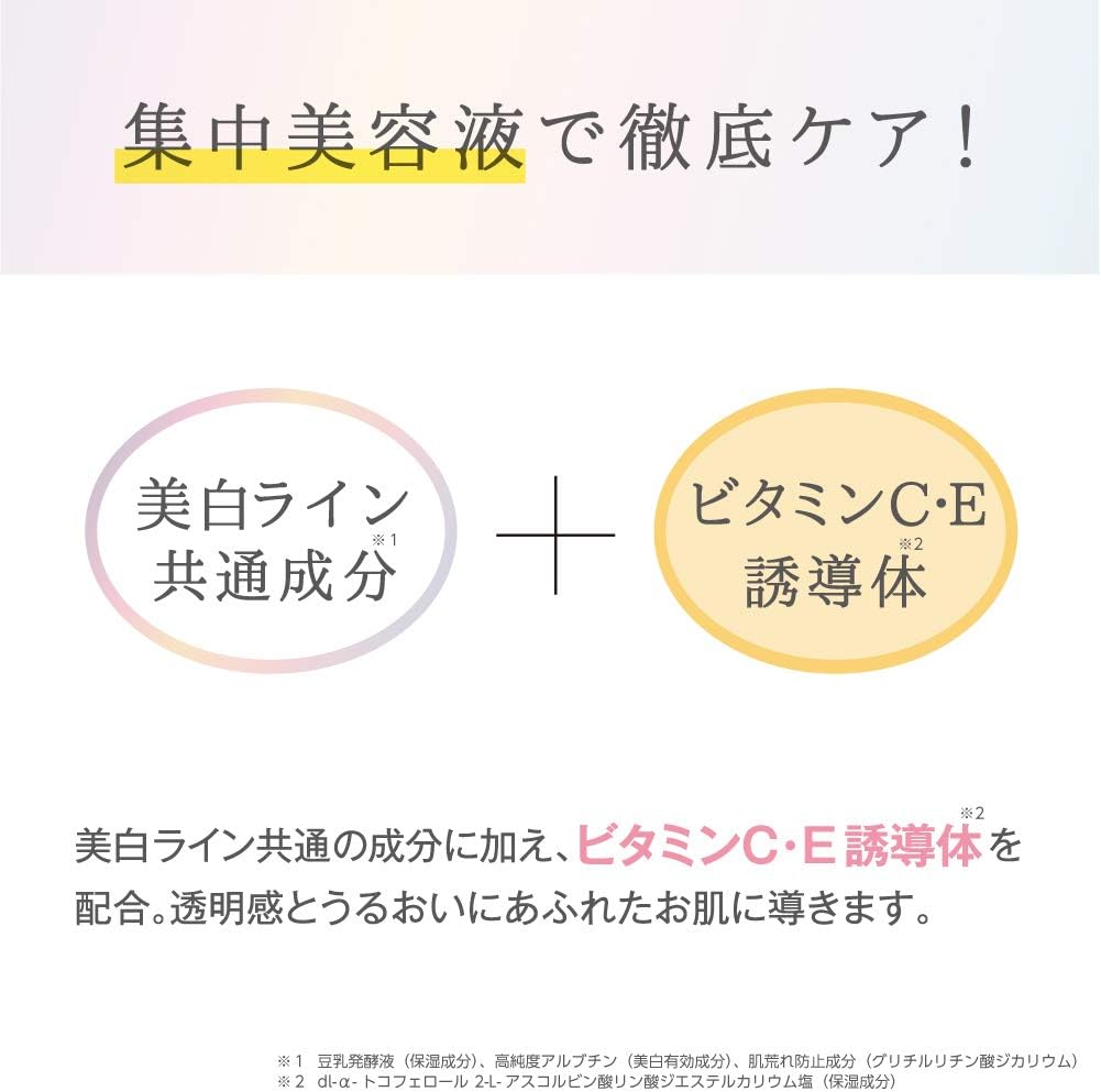 Albutine,Stearyl Glycylretinate, Water, BG, Dark Glycerin, Sugar Sylane, Diglycerin, Polyoxybutylene Polyoxypropylene Glyceryl Ether (3B.O.) (8E.O.) (5P.O.), Soy Milk Fermentation, Dyes Extract, dl-α-Tocopherol 2-L-Ascorbic Acid Diester Potassium salt, acrylic acid Alkyl methacrylate, ethanol, carboxyvinyl polymer, diethylenetrymine pentacetate liquid, stearic acid, cetanol, trimethylglysine, phythosterol, methylpolysiloxane, polythylene glycol, monoparmitrate polyoxyethylene sorbitane (20E.O.), phosphate L-Ascorville Magnet Cium, hydrogenic glyceryl monostearate, sodium hydroxide, soy phosphate additives, partial hydrogen additive jojojoba oil, phenoxyethanol and paraben *mark is an active ingredient. Products without marking are other ingredients.