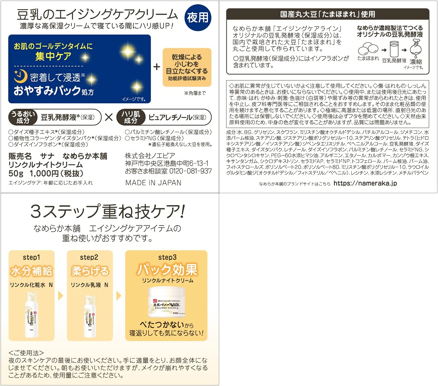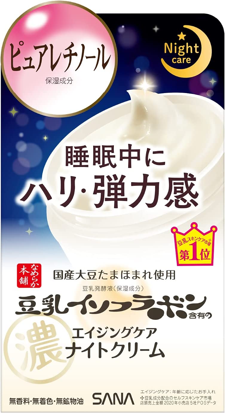 Creme noturno para rugas com leite de soja Formulado com retinol puro *1. O creme espesso penetra completamente. *2 Fórmula Sleeping Pack para cuidado do envelhecimento *3.Não é pegajoso, então você pode se virar sem se preocupar.Reduz rugas secas (testado quanto à eficácia). 1: Ingrediente hidratante *2: Até camadas quadradas *3: Cuidados para a pele de acordo com a idade.