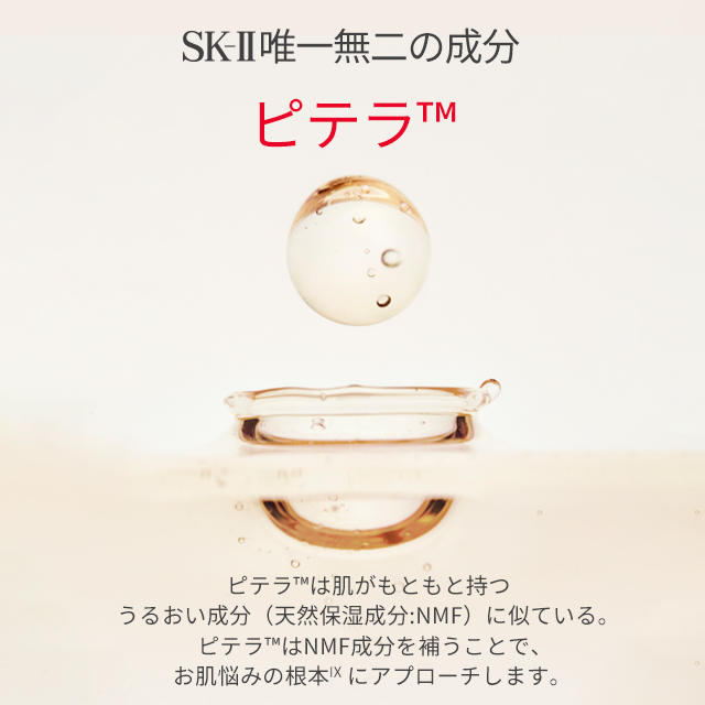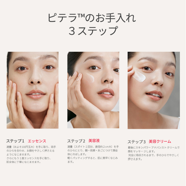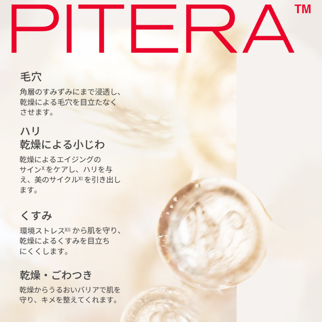 Pitera™, que contém mais de 50 tipos de constituintes, combina bem com a pele e penetra rapidamente em todos os cantos da pele, como se fosse atraído por ela.