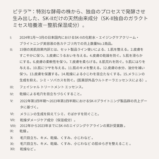Os ingredientes exclusivos de origem natural do SK-II foram criados descobrindo apenas uma cepa de levedura especial entre os 350 tipos de levedura que existiam na época e fermentando-a usando um processo único. A atividade vital do fermento é uma “bênção da natureza” que não pode ser criada artificialmente.