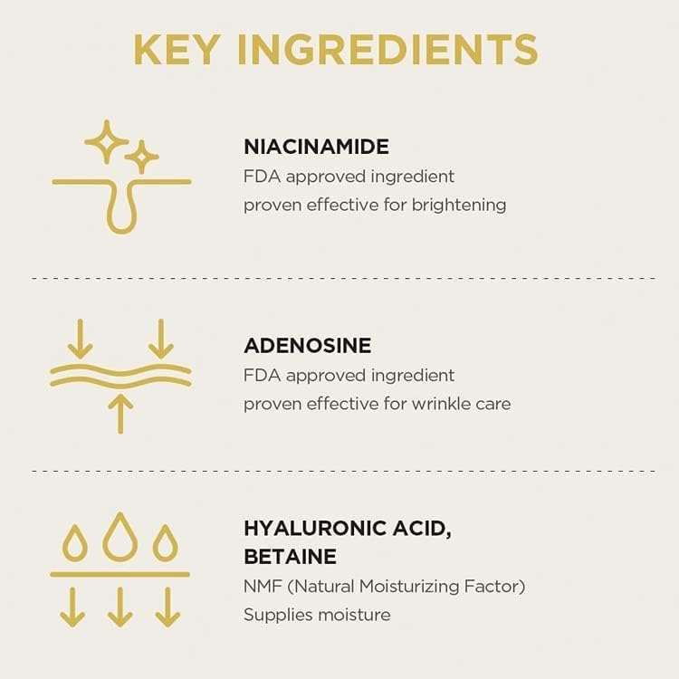 Este produto cosmético de dupla função contém ingredientes de niacinamida e adenosina para clareamento e cuidado de rugas, o que ajuda no tratamento de manchas e firmeza da pele e proporciona cuidados glamorosos e saudáveis.