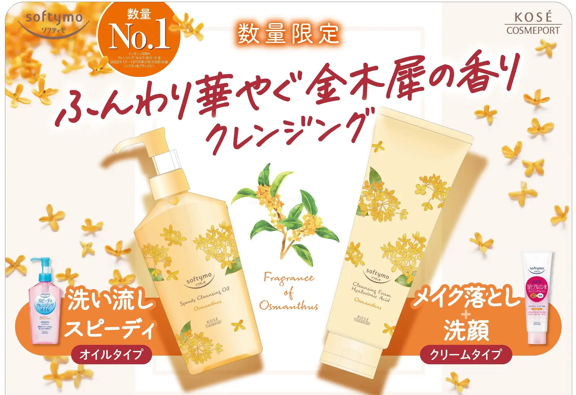 “Speedy Cleansing Oil” e “Cleansing Wash (HA)” são produtos representativos da marca que contam com o apoio de uma ampla gama de clientes. Normalmente, nossos produtos não têm cheiro, mas desta vez usamos as fragrâncias naturais “Osmanthus, Orange, and Lime” para criar um “suave e lindo aroma de osmanthus” que começa com uma nota de saída cítrica levemente adocicada e frutada, e gradualmente desaparece com um aroma suave de osmanthus. Este é um item de edição limitada que você poderá desfrutar apenas neste outono. A embalagem especial traz uma ilustração de Osmanthus e um desenho laranja que evoca a sensação do outono.