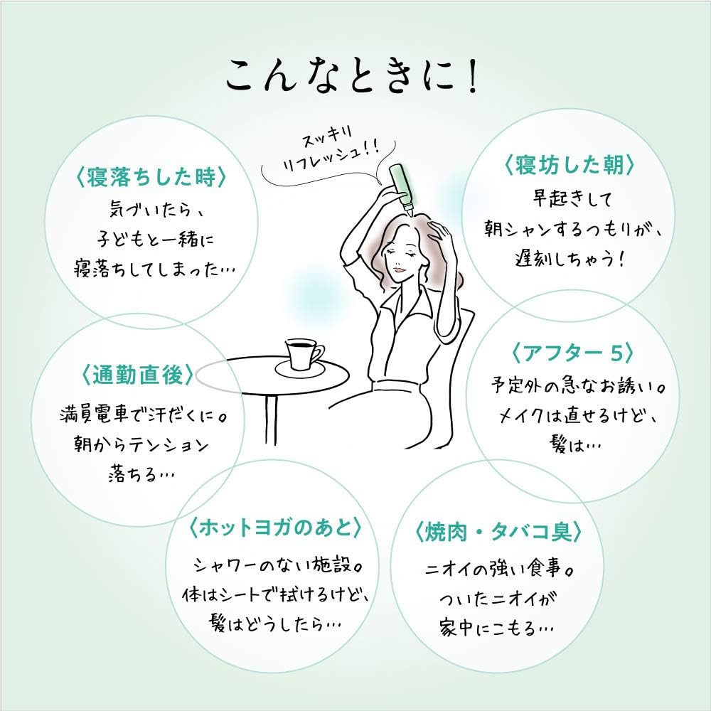 “0 segundos de tempo de espera no salão ” Faça o cabelo em casa depois de voltar do salão . Tempo de banho/ secadora : 0 segundos, shampoo no seu quarto . Obtenha beleza instantânea a qualquer hora e em qualquer lugar. Use quando sentir vontade de lavar o cabelo em uma noite cansativa ou em uma manhã agitada . Tem uma sensação refrescante e deixa o couro cabeludo e o odor limpos e os cabelos saudáveis e macios. Um perfume que combina menta fresca e frutado floral elegante e lindo.